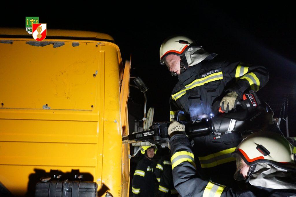 Wie im Ernstfall wurde zuerst der Einsatzbereich abgesichert, eine Beleuchtung aufgebaut und das Fahrzeug mit Keilen gesichert. Anschließend wurde die Rettungsplattform aufgebaut und verschiedene Schnitttechniken mit dem hydraulischen Rettungsgerät ausprobiert um einen Verletzten aus der Fahrerkabine des LKWs zu befreien.