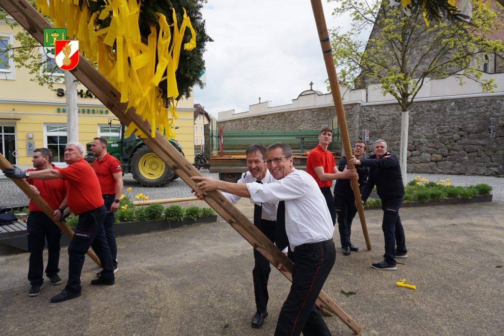 Gestern fand unser traditionelles Maibaumaufstellen am Marktplatz in Naarn statt. Eröffnet wurde das Fest wie gewohnt mit der Florianimesse. Im Anschluss daran stellten die Kameraden den Maibaum händisch mittels Holzschwalben auf.