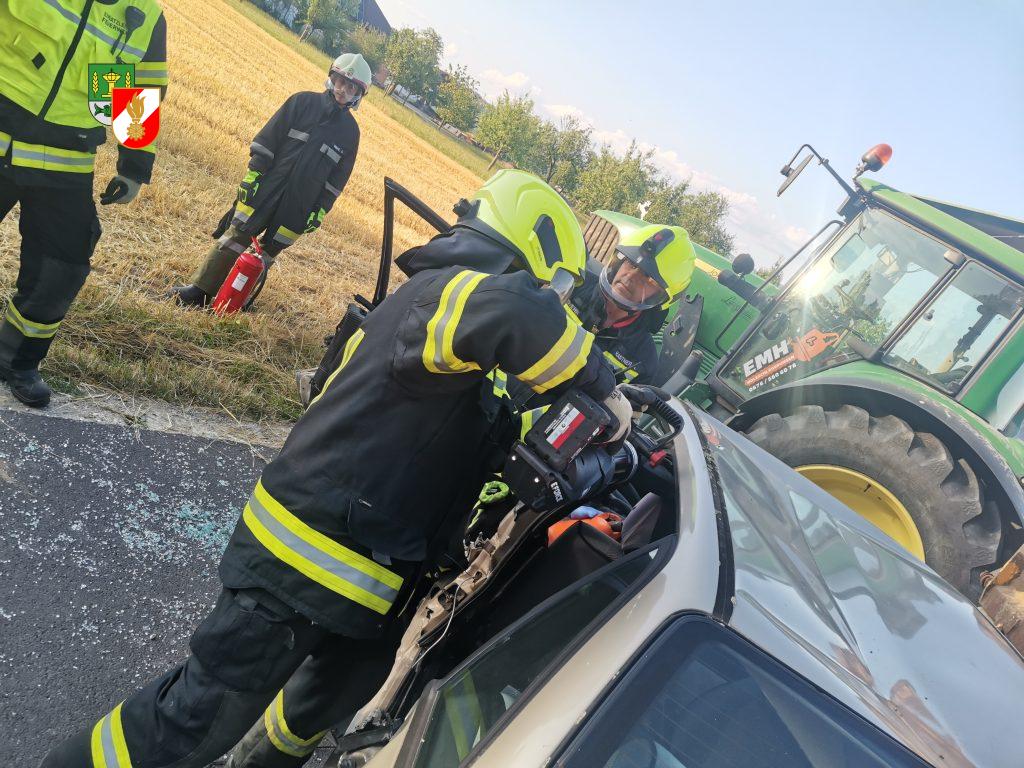 Bei der heutigen Einsatzübung wurde ein Verkehrsunfall mit einem Traktorgespann und einem PKW angenommen. Dabei galt es die eingeklemmte Person möglichst schonend aus dem Fahrzeugen zu retten. Während der Rettungsarbeiten begann ein weiterer Traktor in der Nähe der Unfallstelle zu brennen, sodass sich unsere ULF Besatzung sofort mit der Brandbekämpfung beschäftigte. Die verletzte Person konnte rasch über eine Seitenöffnung gerettet werden und der Brand konnte nach kürzester Zeit gelöscht werden.