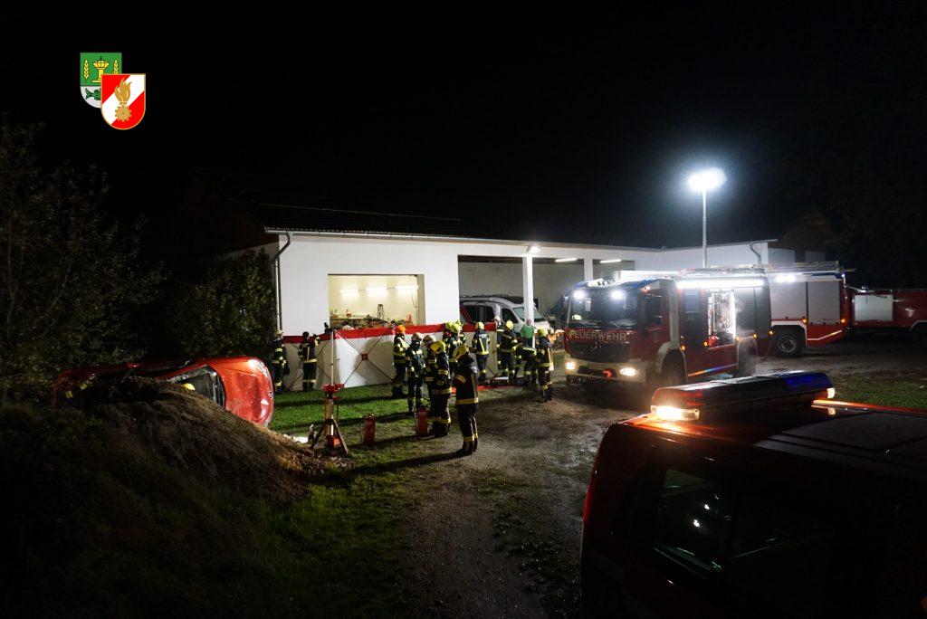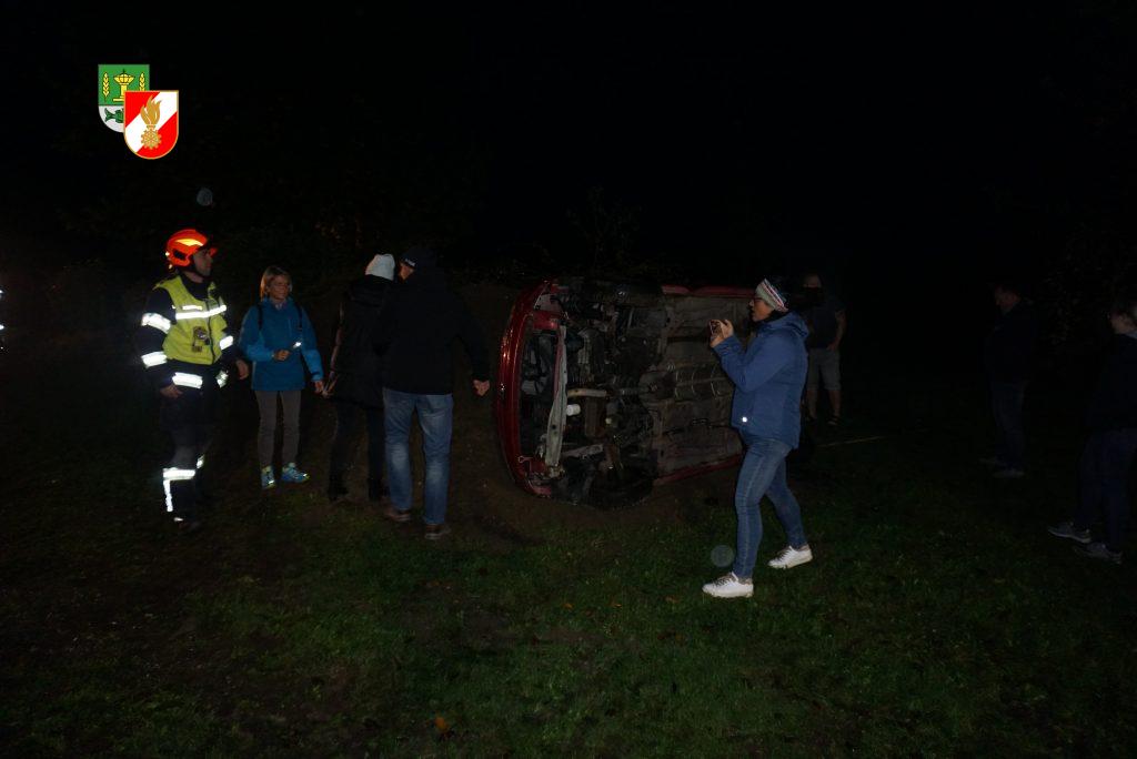 Verkehrsunfall mit mehreren eingeklemmten Personen hieß die Einsatzmeldung der heutigen Einsatzübung. Ein PKW war verunfallt und kam auf der Seite liegend zum Stillstand.