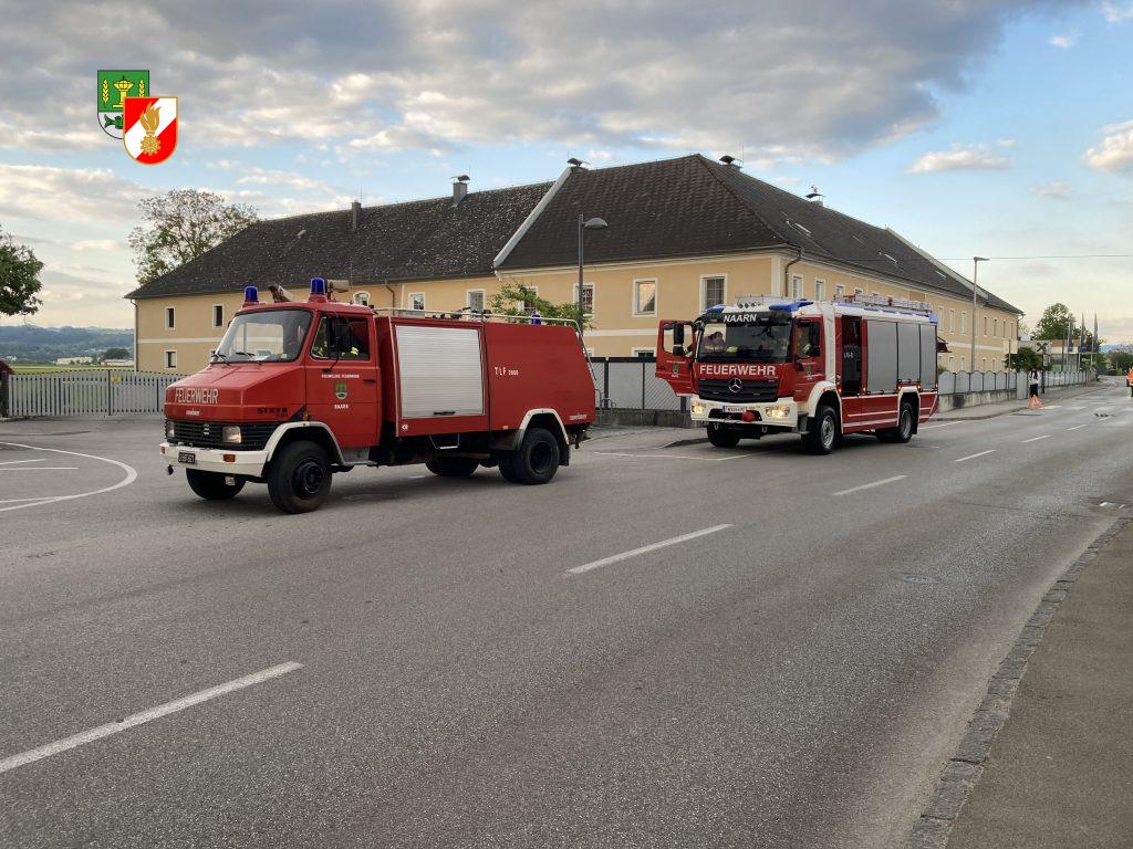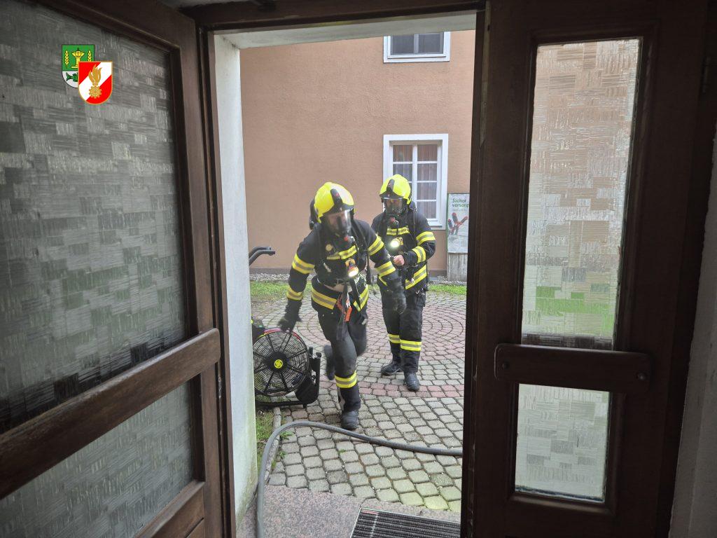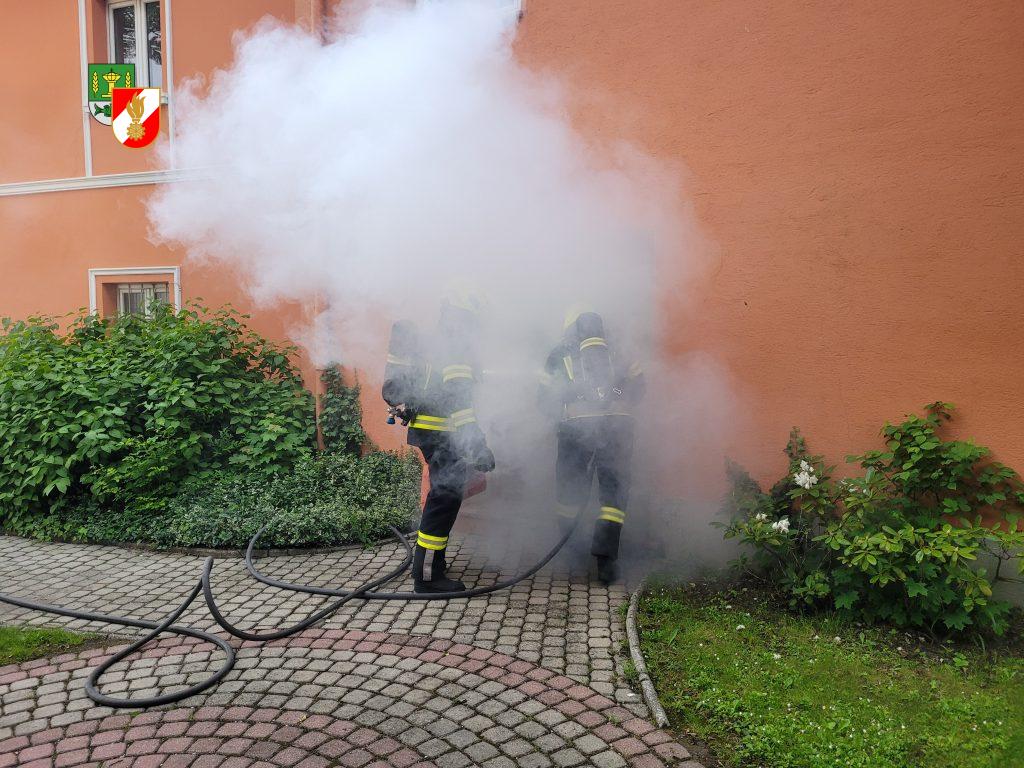 Ein Brand im Erdgeschoss des Gasthaus Schober mit einer vermissten Person war die Ausgangssituation der heutigen Einsatzübung. Da der betroffene Teil des Gebäudes direkt an der Perger Straße liegt wurde diese im Bereich der Kirche Ein Brand im Erdgeschoss des Gasthaus Schober mit einer vermissten Person war die Ausgangssituation der heutigen Einsatzübung. Da der betroffene Teil des Gebäudes direkt an der Perger Straße liegt wurde diese im Bereich der Kirche für die Dauer der Übung für den Verkehr gesperrt. Ein Atemschutztrupp machte sich sofort nach dem Eintreffen am Einsatzort auf den Weg in das stark verrauchte Gebäude um die vermisste Person zu retten. Gleichzeitig wurde eine Zubringerleitung vom nahegelegenen Hydranten aufgebaut und eine Angriffsleitung mit der das Nachbargebäude geschützt wurde. Aufgrund der starken Rauchentwicklung konnte direkt im Bereich des Brandobjekts nur mit schwerem Atemschutz gearbeitet werden. Das Übungsziel war erreicht, nachdem die Person gerettet, der Brand mittels Innenangriff gelöscht und das Gebäude wieder Rauchfrei gemacht worden war, In einer Ausführlichen Nachbesprechung wurde der gesamte Einsatz noch einmal gemeinsam diskutiert und Hausherr Florian Schober erklärte das Gebäude und alle für die Feuerwehr relevanten Zugangsmöglichkeiten.