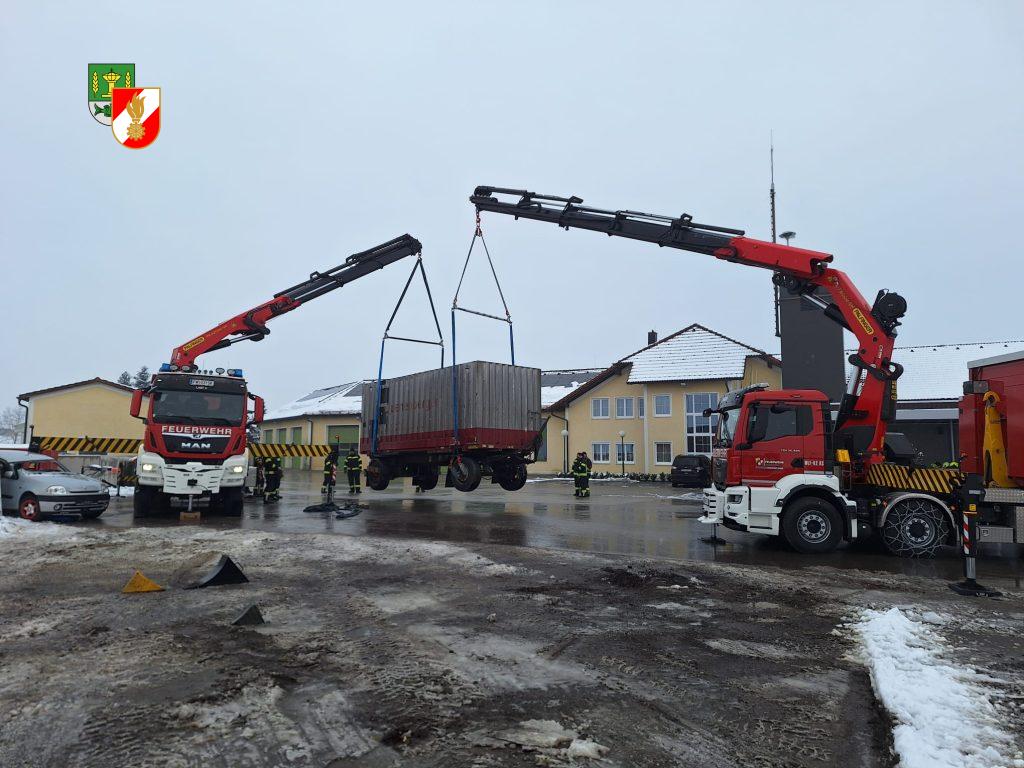 Übungsannahme: Ein LKW- Anhänger ist verunfallt und seitlich umgestürzt. Gemeinsam wurde der LKW Anhäger aufgestellt und einige Szenarien wurden dabei beübt.